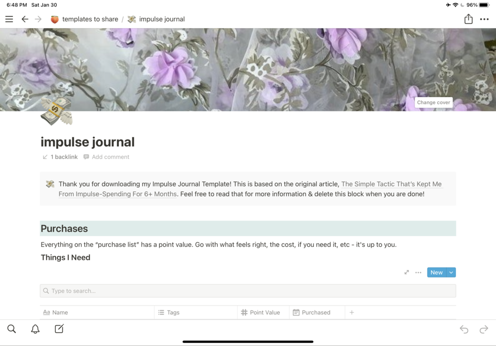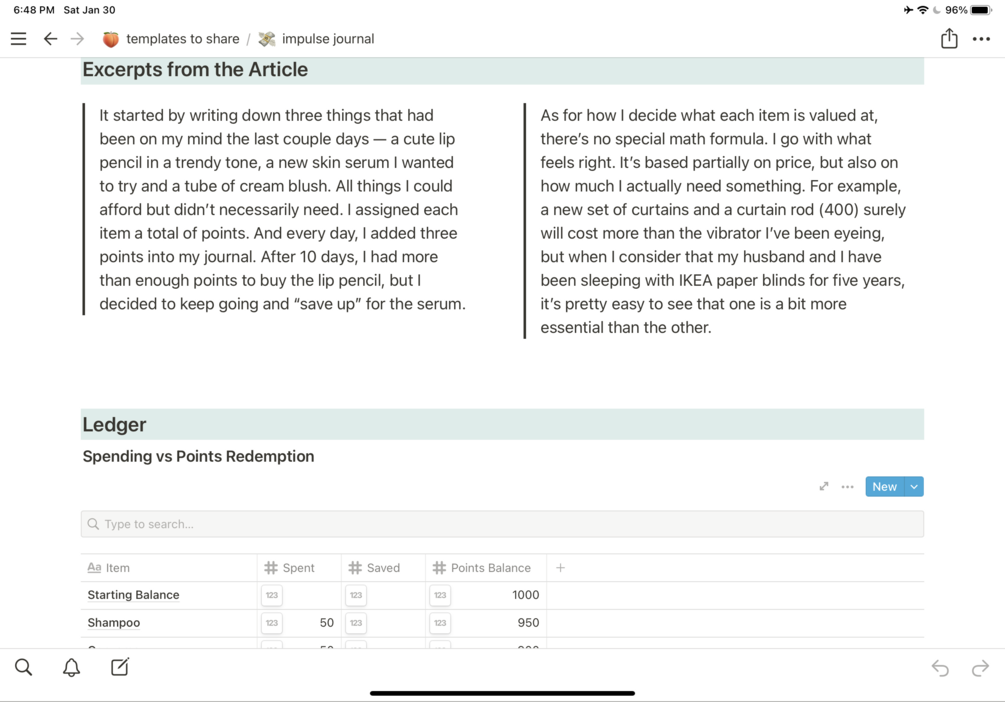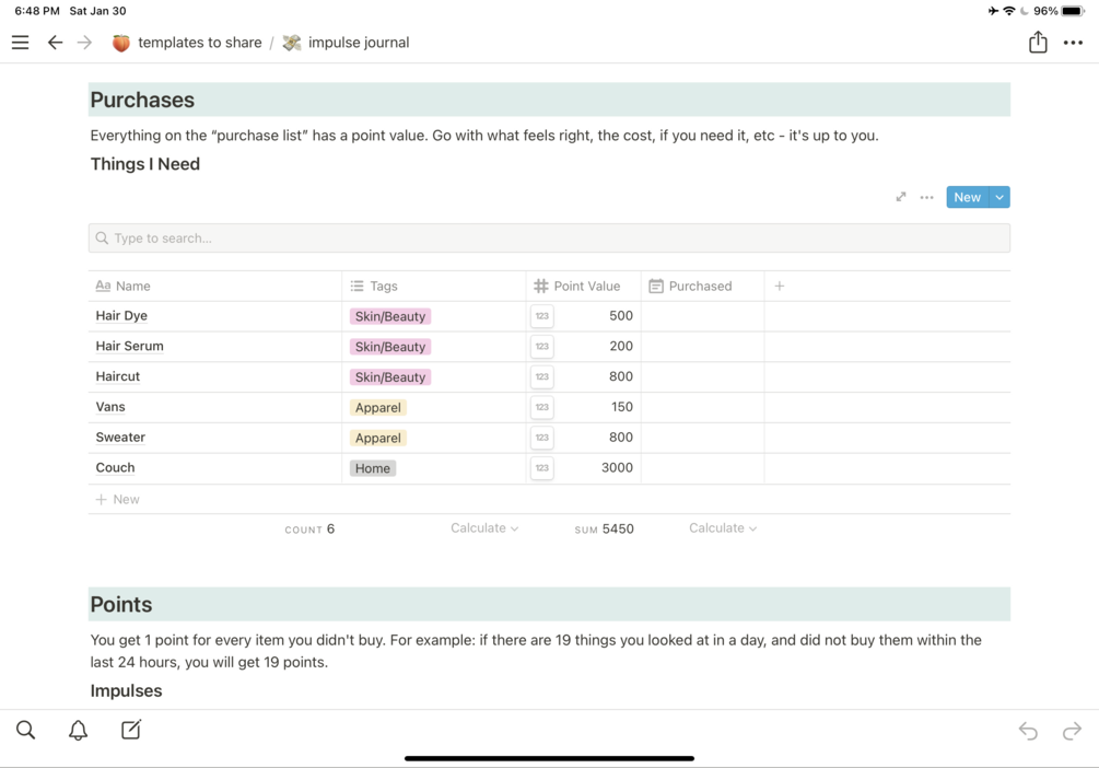 At first glance, it looks like a shopping list. That’s not quite accurate. It’s a list of things I want to buy at some point. The tick marks represent every day I didn’t buy any of those things. So, with 19 things that I’m currently eyeing, and having not purchased any of them in the last 24 hours, I add 19 marks onto my tally. These are my points – currently, I have 673 points accumulated.