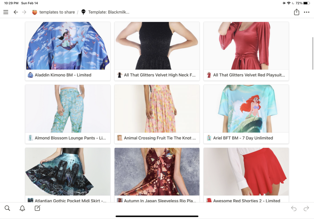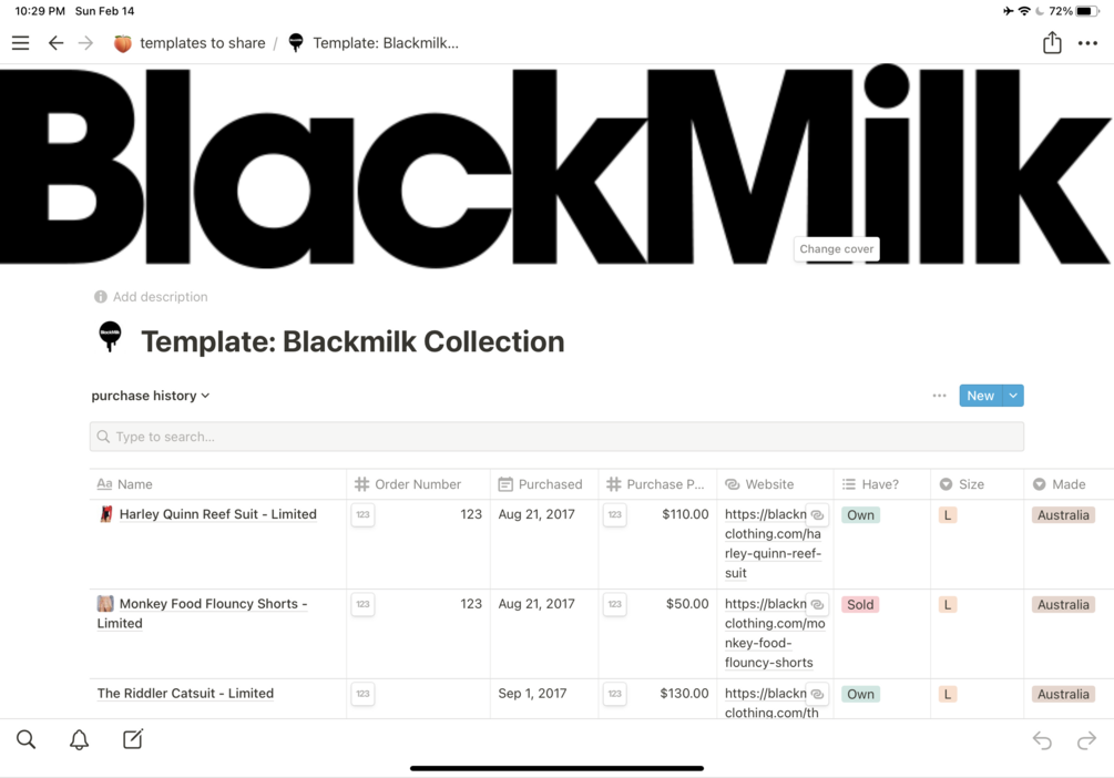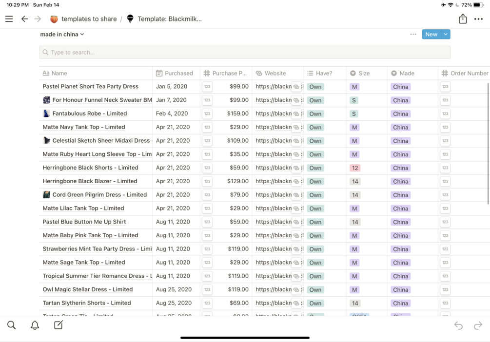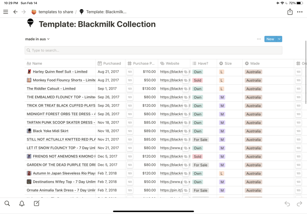 A template for simple tracking of your Blackmilk Collection. Keep track of how it looks, how much it cost, where it was made, and more.
